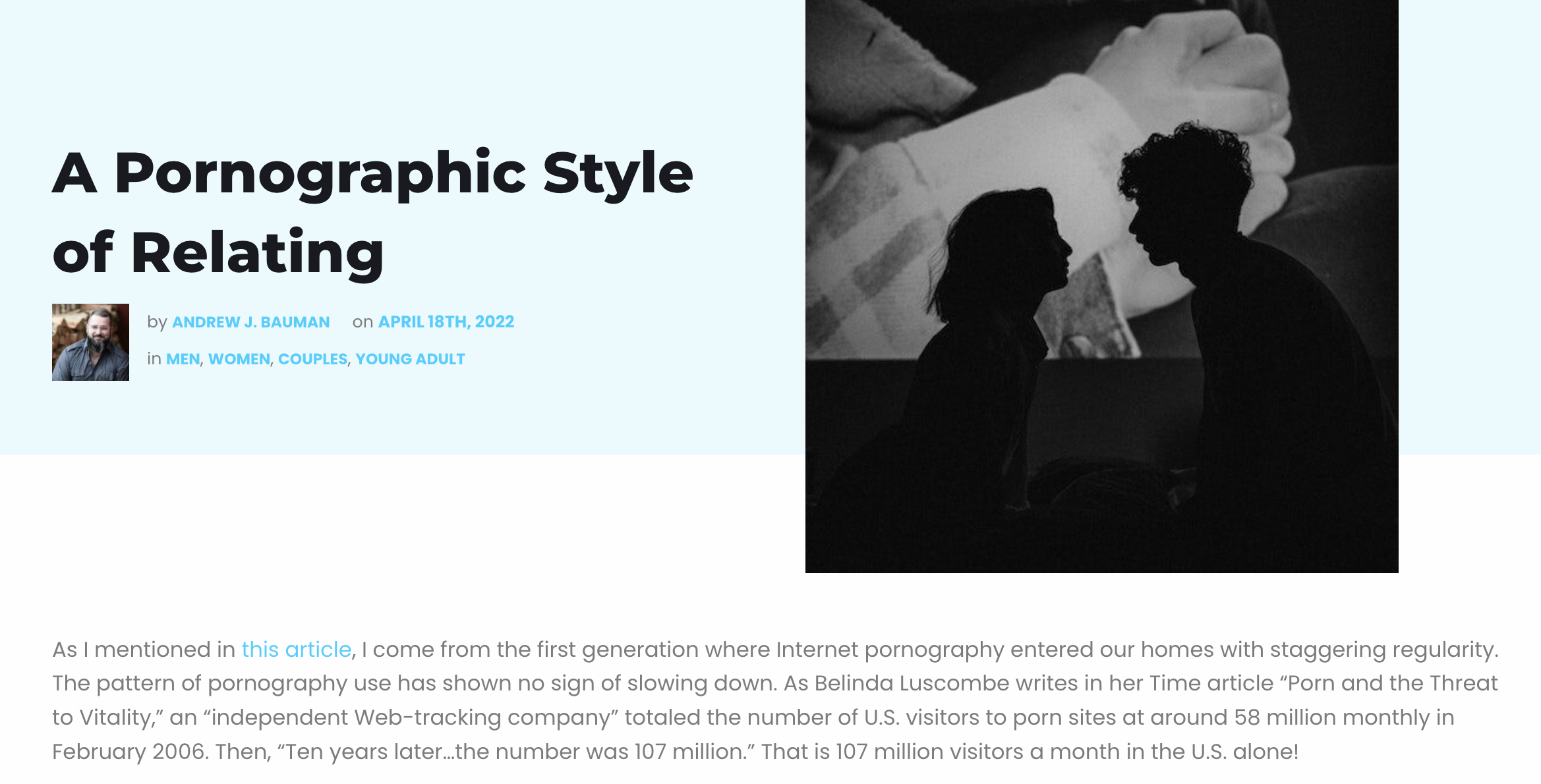 But this also means relearning how to relate to others in a non-pornographic way, a subject Andrew Bauman (a licensed mental health counselor) knows a little something about.