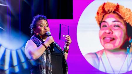 Antes de apresentar as vencedoras das categorias da causa enfrentamento da violência contra mulheres e meninas, Monica Iozzi pediu licença para contar uma história pessoal. Compartilhou com o público então sua experiência de ter vivido, ainda na adolescência, um relacionamento abusivo. "Eu era muito jovem quando fui vítima de um relacionamento abusivo. Foi um dos meus primeiros namoros e eu só fui começar a pensar em cair fora e pedir ajuda muito tempo depois, quando eu fui agredida fisicamente. Antes disso, eu achava o comportamento dele uma coisa natural, uma espécie de prova de amor. Só me liguei que sofria violência quando ele realmente me bateu. Aí eu percebi o que muitas mulheres sofrem, principalmente quando você é jovem, quando você tem filhos com o seu agressor ou quando você tem uma dependência financeira daquela pessoa. Assim como eu não tinha noção do que eu estava vivendo, muitas meninas e muitas mulheres também não têm." Jaqueline Kunã: "É preciso que o Estado olhe para as mulheres indígenas como humanas"  | | Jaqueline Kunâ Aranduhá é vencedora do Prêmio Inspiradoras na categoria Acesso à Justiça | | Imagem: Marina Pekin/UOL |