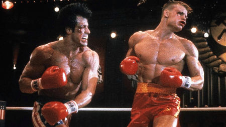 ROCKY IV | | Sylvester Stallone e Dolph Lundgren se enfrentam em 'Rocky IV' | | Imagem: Reprodução/UA/MGM |