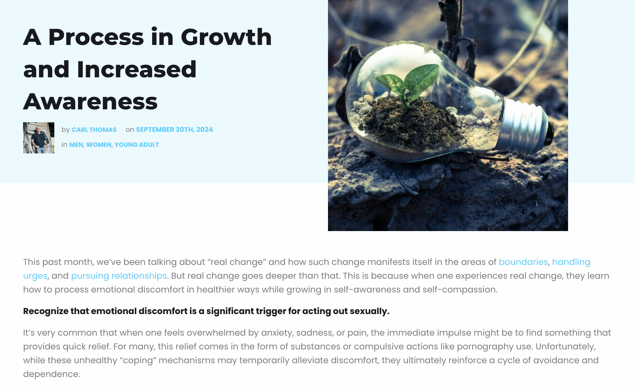 Admittedly, it's more than that. However, without growth and increased awareness, it's very difficult to manage boundaries, urges, and relationships in a healthy way, let alone curb destructive and unwanted sexual behaviors.