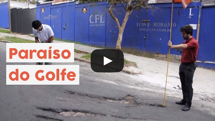 Links do mês #109 e o ano em que Porto Alegre virou um campo de golfeVem conhecer a história de como 50 reais viraram uma campanha nacional de combate ao descaso com as ruas pelo BrasilO ano era 2011. Eu e dois amigos tínhamos um projeto paralelo chamado Shoot The Shit. A maioria aqui deve saber da Shoot, mas quem chegou recentemente por outros motivos talvez não conheça. A Shoot tinha uma dinâmica muito simples: nós nos reuníamos semanalmente para pensar projetos criativos que ajudassem a melhorar a cidade de Porto Alegre. Esses brainstorms eram super abertos. Não havia muito direcionamento. Não tínhamos dinheiro, nem formatos ou prazos para cumprir. Nossas únicas obrigatoriedades eram gastar pouco e ser criativo. Como não tínhamos verba, nossos projetos eram em sua maioria intervenções urbanas. Coisas que fazíamos na cidade justamente por ela ser “de graça”. Certo dia, depois de uma viagem de férias à Inglaterra, o Gabriel chegou na nossa reunião semanal contando que havia comprado um taco de golfe. Ele não era um golfista e tampouco havia jogado golfe na vida. Gabriel era apenas uma pessoa aleatória que comprava coisas que achava interessante. Como na época a Libra Esterlina e o Real estavam mais próximos no quesito valor, o taco e a bolinha não custaram nem 50 mangos. Com um objeto tão distante da nossa realidade assim, começamos a pensar, nas nossas reuniões, em como usar ele para fazer alguma intervenção, porém nenhuma ideia boa surgiu. Vida que segue. Acontece bastante de um brainstorm não render. Dias mais tarde, estávamos indo para mais uma das nossas reuniões, quando, ao atravessar a rua, nos deparamos com um buraco no asfalto. Como 99,999999% das cidades brasileiras, Porto Alegre era (e ainda é) uma cidade esburacada. No momento que vimos o buraco, o taco de golfe se pagou: tivemos a ideia de jogar golfe nos buracos do asfalto da cidade para protestar contra a buraqueira da cidade. Bingo. Mapeamos alguns buracos “bons” para a prática do golfe, conseguimos emprestado uma bandeira oficial usada em campos de golfe, nos vestimos à caráter e, em uma manhã nublada de domingo, praticamos o esporte no asfalto porto-alegrense, gravando tudo para transformar a performance em um vídeo. O conceito criativo do projeto era “Porto Alegre, paraíso do golfe”. O vídeo era uma grande ironia sobre como a cidade era um ótimo lugar para a prática desse esporte. Por algum motivo, a gente achou legal levar o conceito de “paraíso” para os nossos nomes, e é por isso que no vídeo somos Luciano Heaven, Giovani Sky e Gabriel Paradise. Por quê fizemos isso? Vai lá saber haha Estávamos nos divertindo criando uma esquete, totalmente livres para criar o material que mais nos agradasse, ao invés de agradar um cliente. Reparem que eu e o Gabriel estávamos usando sapato social para jogar golfe. Na nossa cabeça, um esporte tão elitizado assim era jogado com calça e sapato social kkkkk Como a Shoot The Shit não tinha site, blog ou nenhum canal relevante, criamos um tweet igual e nós 3 postamos em nossas redes sociais (Twitter e Facebook só, pois o Instagram ainda era um lugar para postar apenas fotos de comida e pôr do sol). Daí um tweet retweetou um tweet, e esse processo aconteceu outras milhares de vezes. Em dois dias, o vídeo era capa do Youtube no Brasil como um dos vídeos mais vistos com a tag humor. Daí o Brainstorm9 postou no seu blog, o Marcelo Tas fez o mesmo, e na mesma semana a gente era entrevistado pelo Bom Dia Brasil. Foram 7 dias malucos. Demos entrevista para Band, Globo, SBT, Record, Terra. Aparecemos em programas ao vivo jogando golfe no estúdio de gravação. Fomos convidados por um Golf Club para aprender o esporte. Ganhamos um prêmio no Festival de Publicidade como melhor ideia de impacto social. E como estávamos praticando um esporte, até o Globo Esporte deu moral para o vídeo (nada mais justo). Aqui um videocase mostrando várias dessas aparições. Eram tantas aparições na TV aberta que a prefeitura teve que se mexer — leia-se fazer o seu trabalho. Como nós marcamos no vídeo as ruas em que jogamos golfe, a prefeitura foi lá e tapou os buracos dessas mesmas ruas, com o objetivo de impedir que a gente continuasse dando entrevista ao lado dos buracos já famosos. Se você pensar que investimos apenas R$ 100 (taco, bolinha e gasolina), 10h de planejamento e mais umas 10h de execução (filmagem e edição do vídeo), o resultado foi estratosférico. Os 90 mil views no Youtube podem não parecer nada, —hoje um Tiktok qualquer pode chegar a milhões de visualizações — mas em 2011, 90 mil views era praticamente “parar” a internet. E não só mobilizamos pessoas online, como fizemos a pauta chegar na prefeitura e ela ativamente melhorar algo na cidade. Esse projeto mudou as vidas minha, do Gi e do Gab. E reforço: custou 50 reais. Corrigindo o valor para os dias atuais, seria, sei lá, R$ 300? (Na real joguei aqui no ChatGPT e ele falou 117,50 reais) Foi um projeto feito com nosso amor pela comédia e pela criatividade, junto de um conceito bem amarrado e que ressoava nas pessoas (todo mundo no Brasil mora em uma cidade esburacada). E que eu quis compartilhar com vocês para lembrar a gente (eu, incluso) de que, às vezes, não precisamos de cliente, de grande investimento, de edição profissional, de uma planilha enorme ou um deck de 40 slides para causar algum impacto. Precisamos apenas amar o que estamos fazendo. E fazendo porque queremos fazer. Espero que gostem dos links: