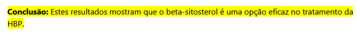 | Eles analisaram 177 pacientes com HPB, cuja metade estava ingerindo beta-sitosterol e repararam melhora significativa neste último grupo. Veja a conclusão do estudo: |