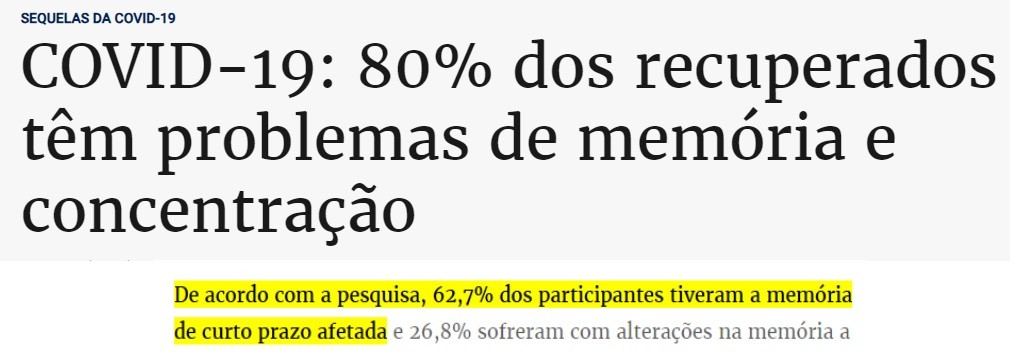 | Esses todos são casos em que nossa Memória a Curto Prazo falha... Se você passa por isso diariamente, significa que sua Memória a Curto Prazo pode não estar 100%. | Um fenômeno recente também prejudicou esse tipo de memória em milhões de pessoas. A pandemia de covid-19. Você já deve ter ouvido relatos de amigos e parentes que tiveram piora na memória meses após se recuperarem de covid, certo? Pois isso foi comprovado por estudos. | |