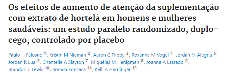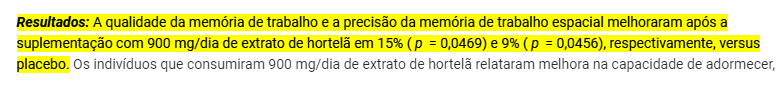 | "O presente estudo demonstra que a suplementação crônica com 900 mg de PSE melhora o desempenho cognitivo em uma população jovem e ativa, apoiando ainda mais o PSE (extrato patenteado de hortelã) como um nootrópico eficaz." |