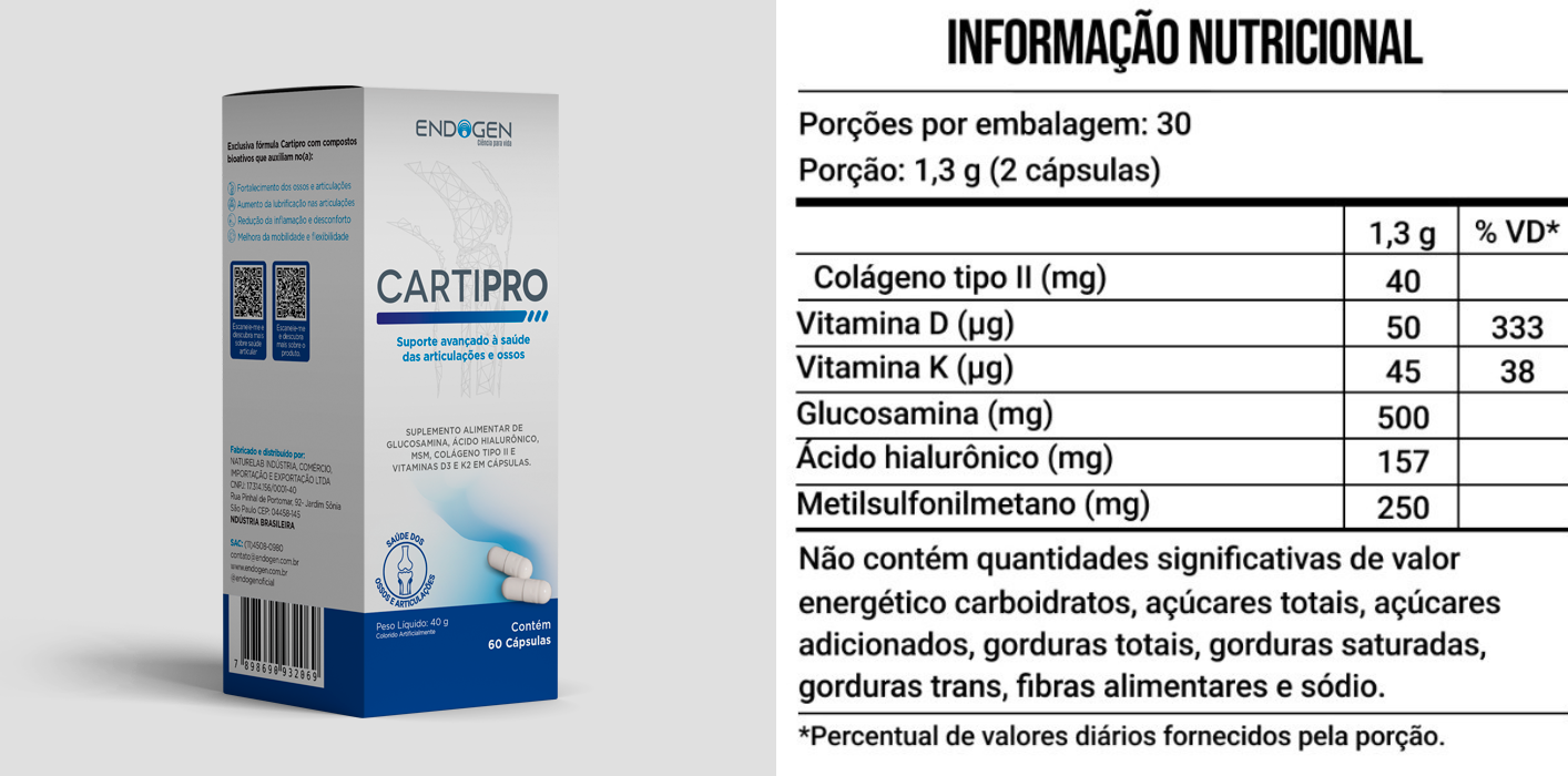 | A sardinha é uma excelente fonte de vitamina D3, essencial para a absorção do cálcio e a manutenção da saúde óssea e articular. A deficiência de vitamina D está associada ao aumento da inflamação e ao enfraquecimento das articulações, o que pode levar a dores e rigidez. | | | Para facilitar a ingestão destes 5 nutrientes (MSM + Ácido Hialurônico + Colageno II + Glucosamina + Vitamina D3), a Endogen criou o CARTIPRO! | Se quiser conhecer melhor todos os nutrientes deste suplemento, clique aqui ou no botão abaixo. | |