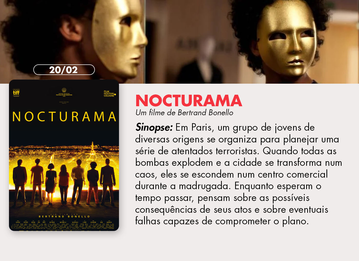 Na sequência, a plataforma recebe Nocturama, thriller eletrizante de Bertrand Bonello que acompanha um grupo de adolescentes envolvidos em uma série de ataques terroristas em Paris.