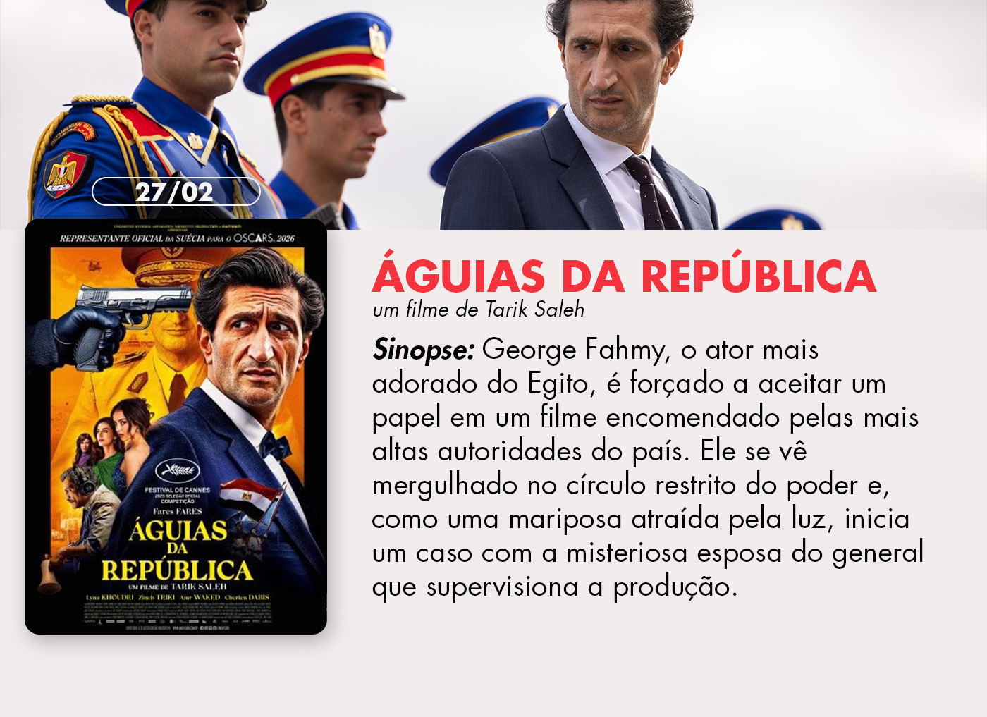 E para fechar a programação, Águias da República chega direto dos cinemas à Reserva Imovision. Indicado à Palma de Ouro no Festival de Cannes, o filme é um drama histórico poderoso que escancara as tensões e contradições da realidade egípcia.